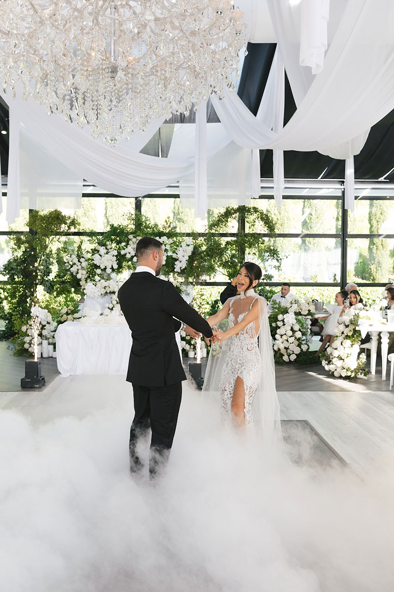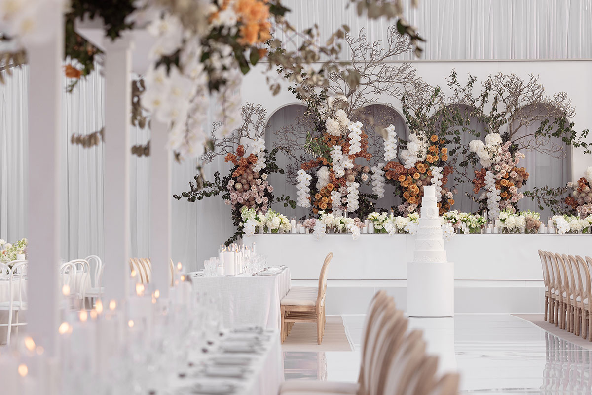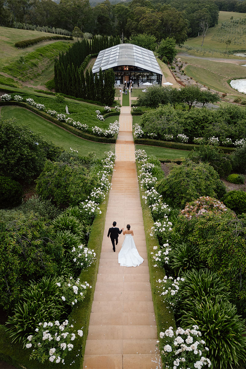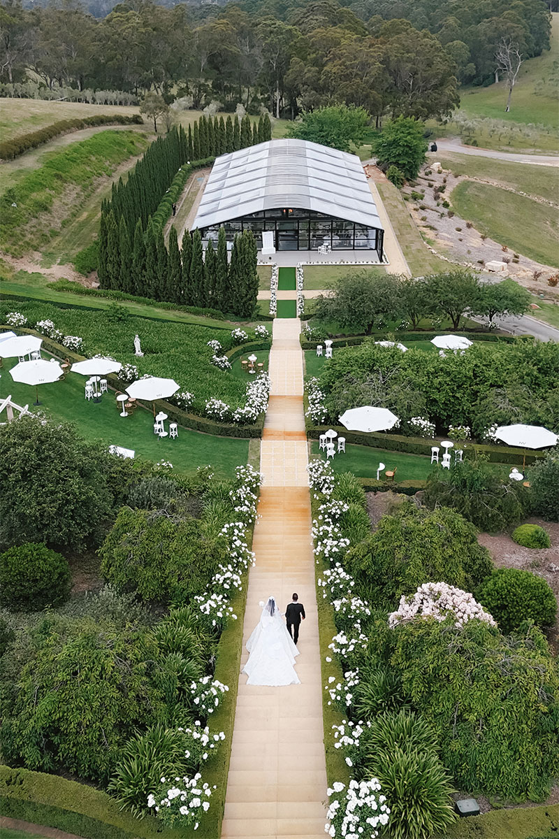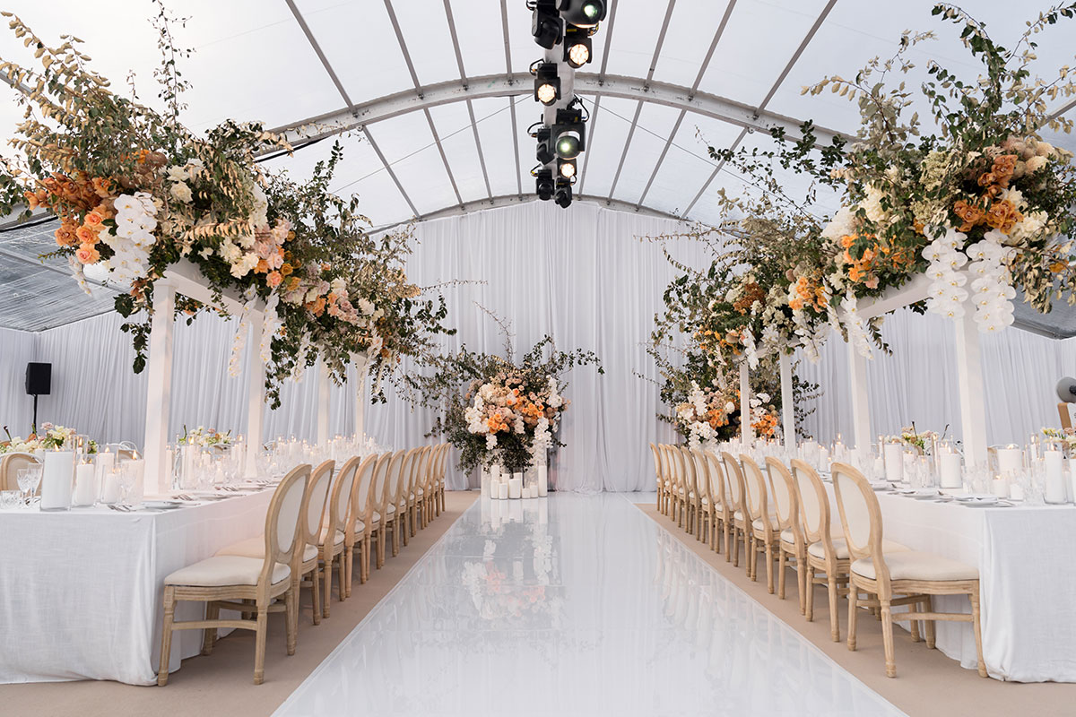 The Atrium is a stylish and elegant marquee set within the stunning gardens and olive farm. This versatile space blends the beauty of nature with sophisticated comfort, creating the perfect atmosphere for a memorable experience. With its spectacular view, the Atrium is the ideal setting for an exquisite wedding reception.